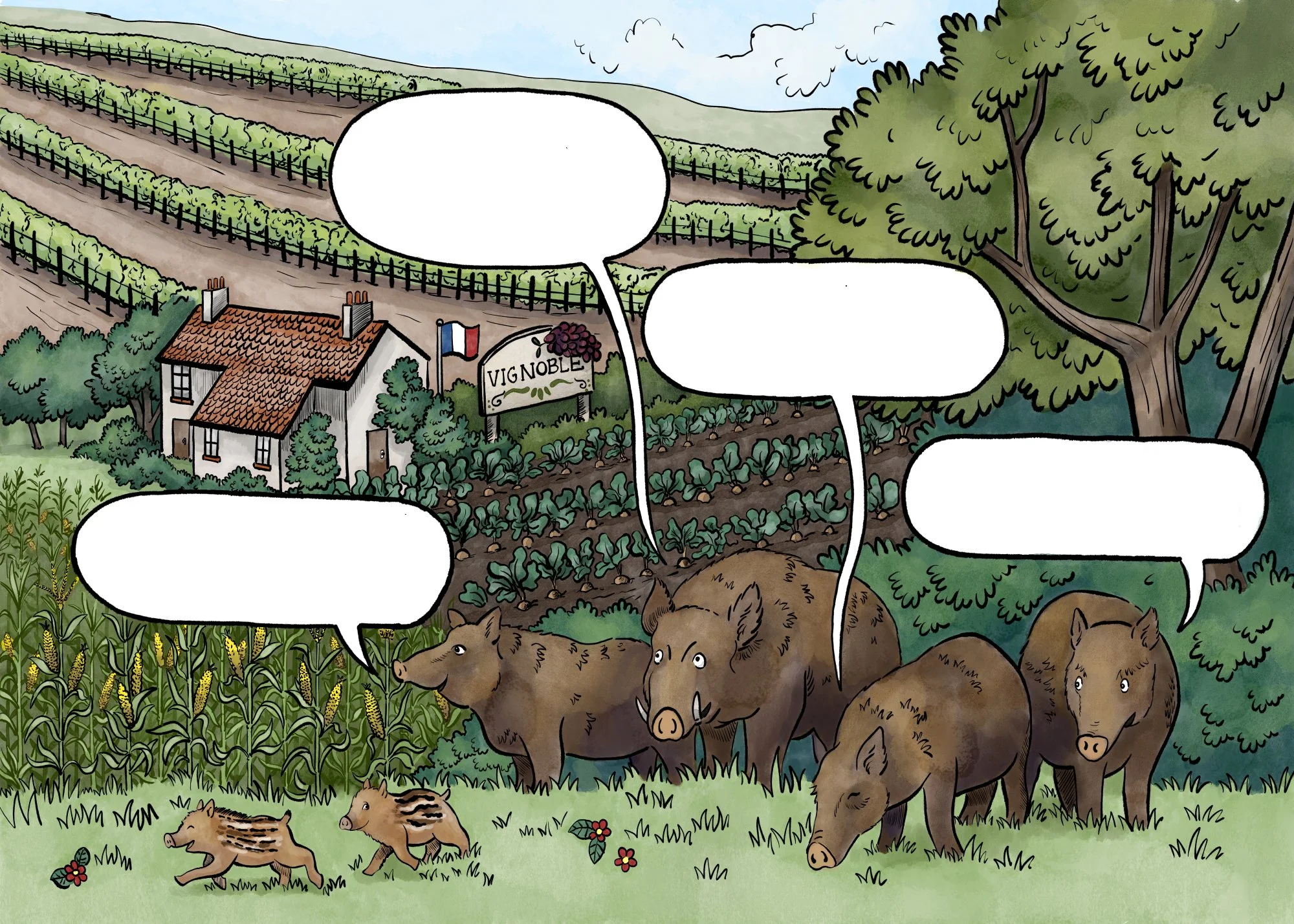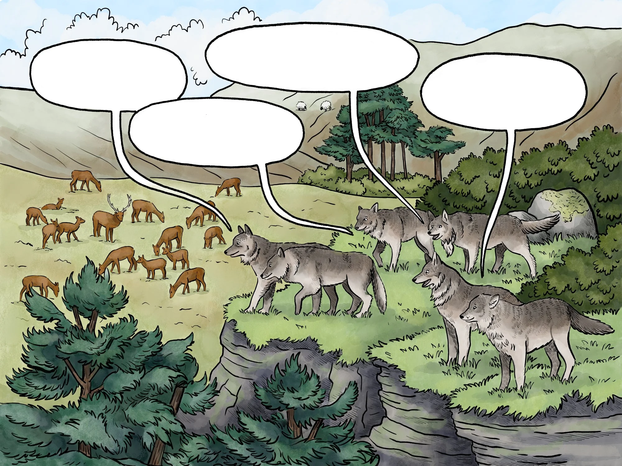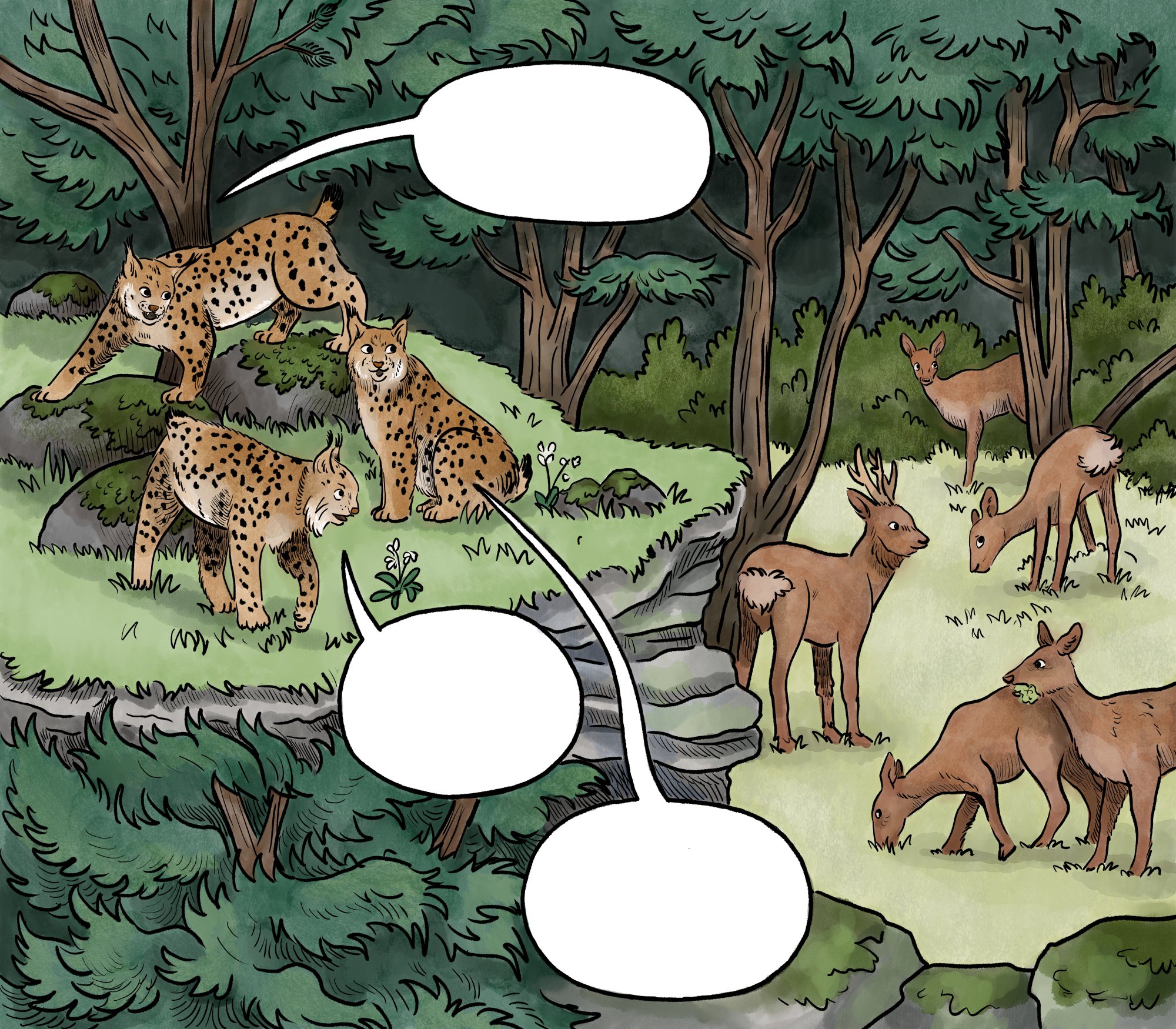A series of illustrated comic panels for a new outdoor walkway at Landmark Adventure Park, telling the story of rewilding and wildlife reintroduction in the Scottish Highlands.